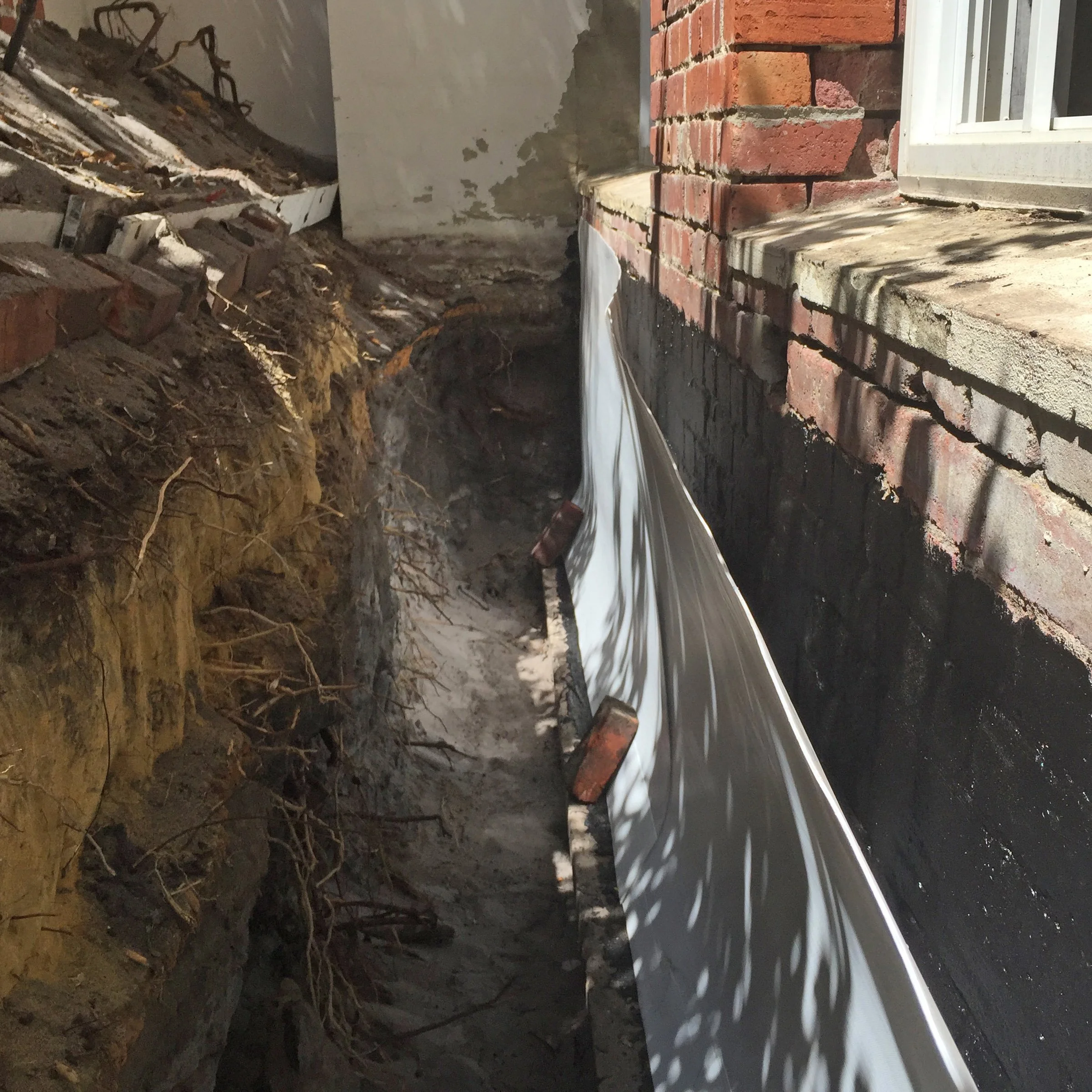1/ A trench is dug around the effected area in to steer water away from the building and a waterproof membrane is installed against the masonry.